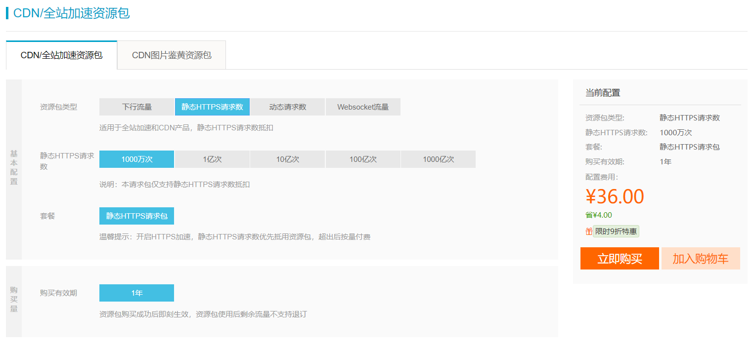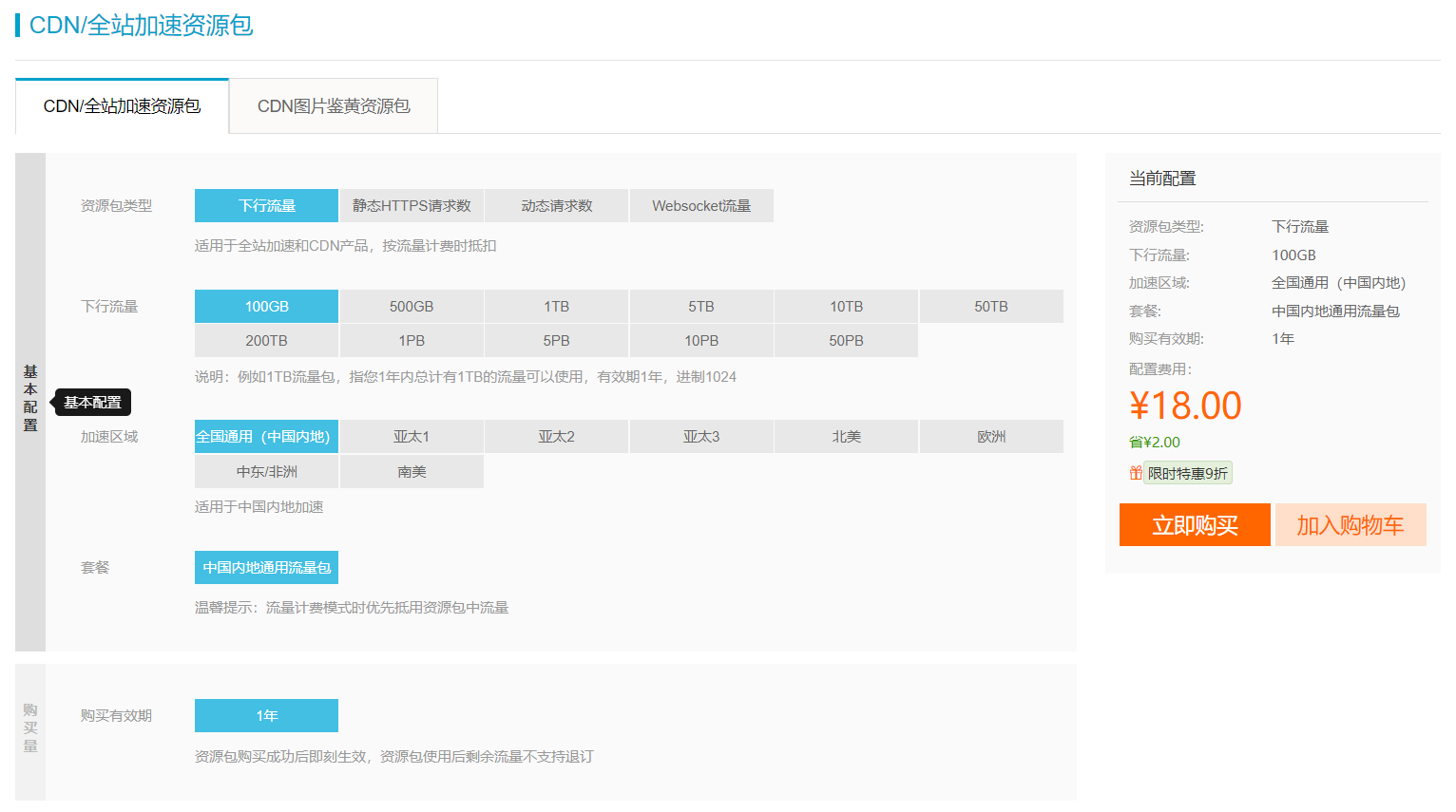 下行流量和HTTPS请求数即是用户访问你的网站产生的流量和请求,其实一般流量都很小,收费很少甚至会被抹零,在阿里云账户里预存10块钱也能用一年。当然,如果你不放心,买以下两个资源包即可一劳永逸了