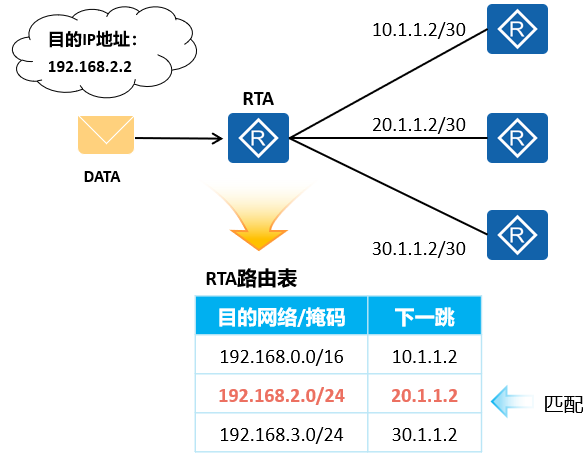 - 根据最长匹配原则进行匹配,能够匹配192.168.2.2的路由存在两条,但是路由的掩码长度中,一个为16 bit,另一个为24 bit,掩码长度为24 bit的路由满足最长匹配原则,因此被选择来指导发往192.168.2.2的报文转发。