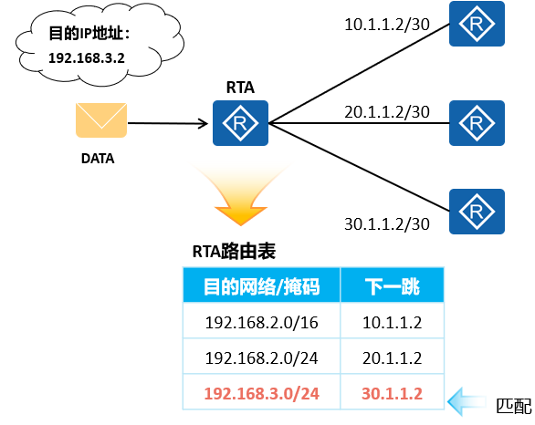 - 根据最长匹配原则匹配,能够匹配到192.168.3.2的路由只有一条,此路由为最终转发依据。