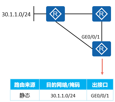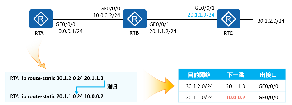 - 去往30.1.2.0/24的路由通过递归查询得到一个直连的下一跳,该路由因此生效。