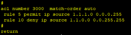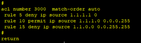 如果在acl 3000中插入`rule deny ip source 1.1.1.1 0`(目的IP地址是主机地址,优先级高于上图中的两条规则),系统将按照规则的优先级关系,重新为各规则分配编号。插入新规则后,新的排序如下。