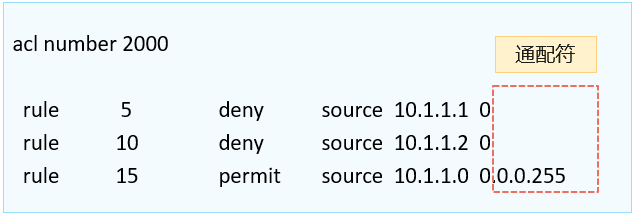 组成:*rule + (规则ID) + 动作(deny拒绝/permit 允许) + source + IP地址 + 通配符*