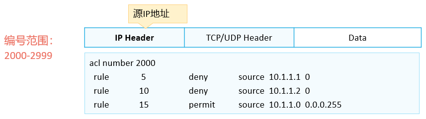 | 基本ACL | 2000~2999 | 源IP地址等 |
