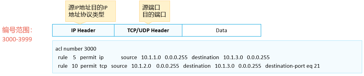 | 高级ACL | 3000~3999 | 源IP地址、目的IP地址、 源端口、目的端口、协议 |